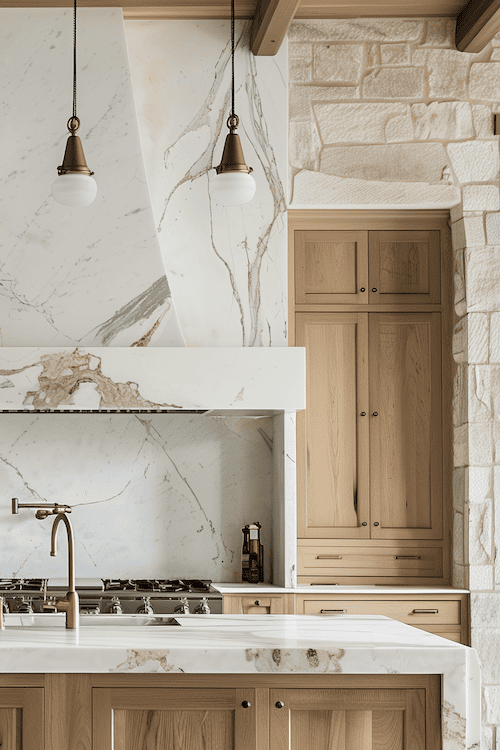 I also love how white oak floors look particularly stunning with antique brass fixtures and a German smear stone backsplash. The light color of the wood helps to brighten up the space and balances the warmth of the brass and the rustic texture of the wall stone.