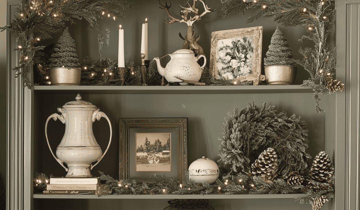 Vintage-style ornaments work beautifully here, think brass, ceramic, or wood.